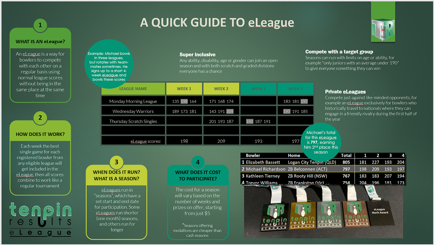 An eLeague is a competition where you can compete against bowlers from around the country using your regular league scores, all you have to do is sign up and let TenpinResults take care of the rest!